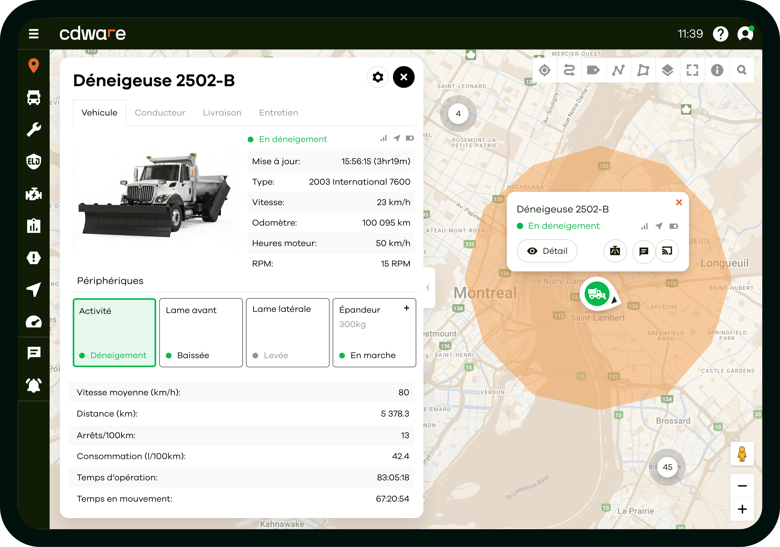 En matière de déneigement, chaque seconde et chaque chargement comptent. Un itinéraire manqué, un camion mal placé ou une utilisation excessive de sel peuvent entraîner des retards, des risques pour la sécurité et des dépassements de budget. C’est pourquoi CDWare offre aux flottes de déneigement la visibilité, le contrôle et la précision nécessaires pour intervenir plus rapidement et plus efficacement, quelles que soient les conditions.
